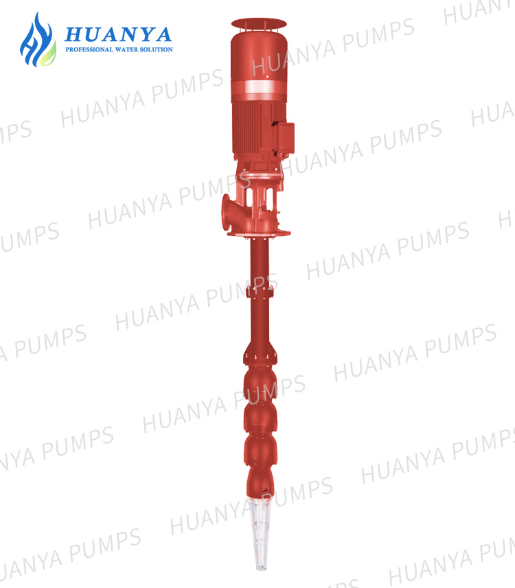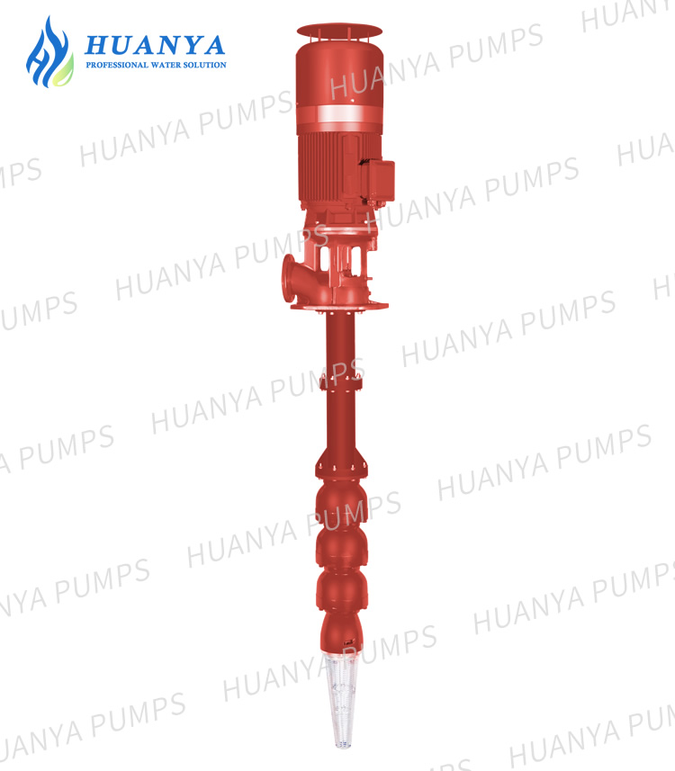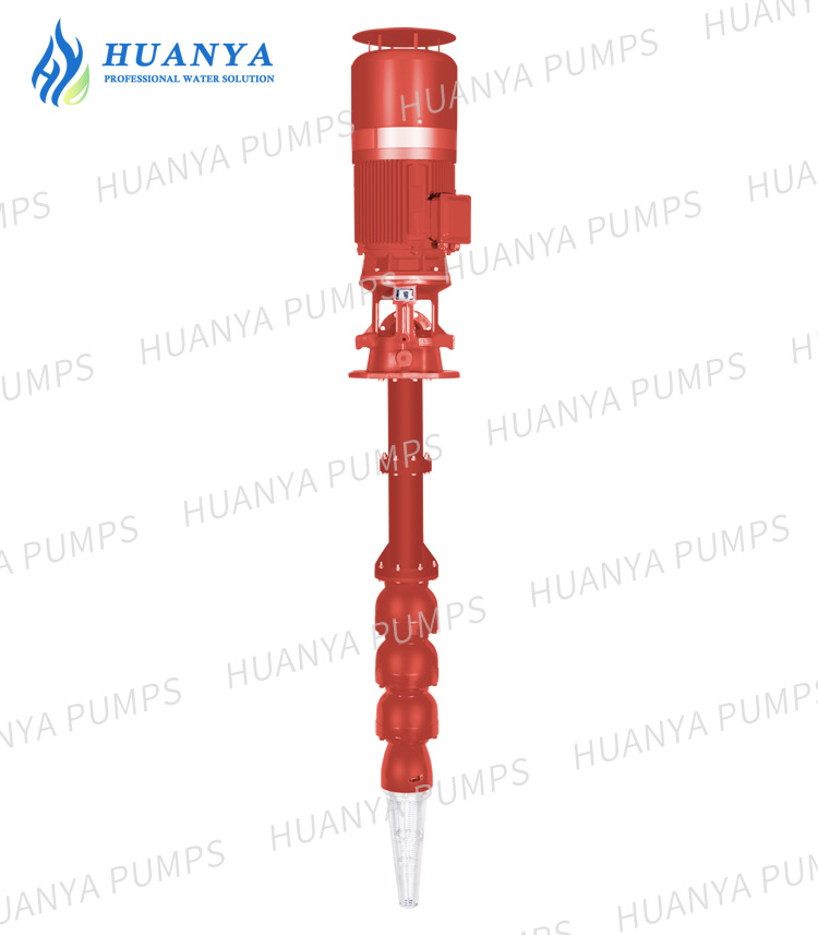 深井消防泵組由多個(gè)離心式葉輪和導(dǎo)流殼、揚(yáng)水管、傳動(dòng)軸、泵座、電動(dòng)機(jī)等部件組成。泵座和電機(jī)位于水池上方,電動(dòng)機(jī)的動(dòng)力通過(guò)與揚(yáng)水管同心的傳動(dòng)軸傳遞給葉輪軸,從而產(chǎn)生流量和壓力。